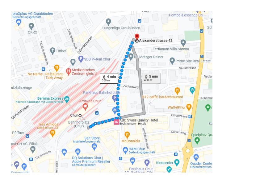 Wegbeschreibung: - Ab Bahnhofplatz Richtung Nordosten auf der Ottostrasse - Links Abbiegen auf die Alexanderstrasse - Das Ziel erreichen Sie nach 260m auf der rechten Seite